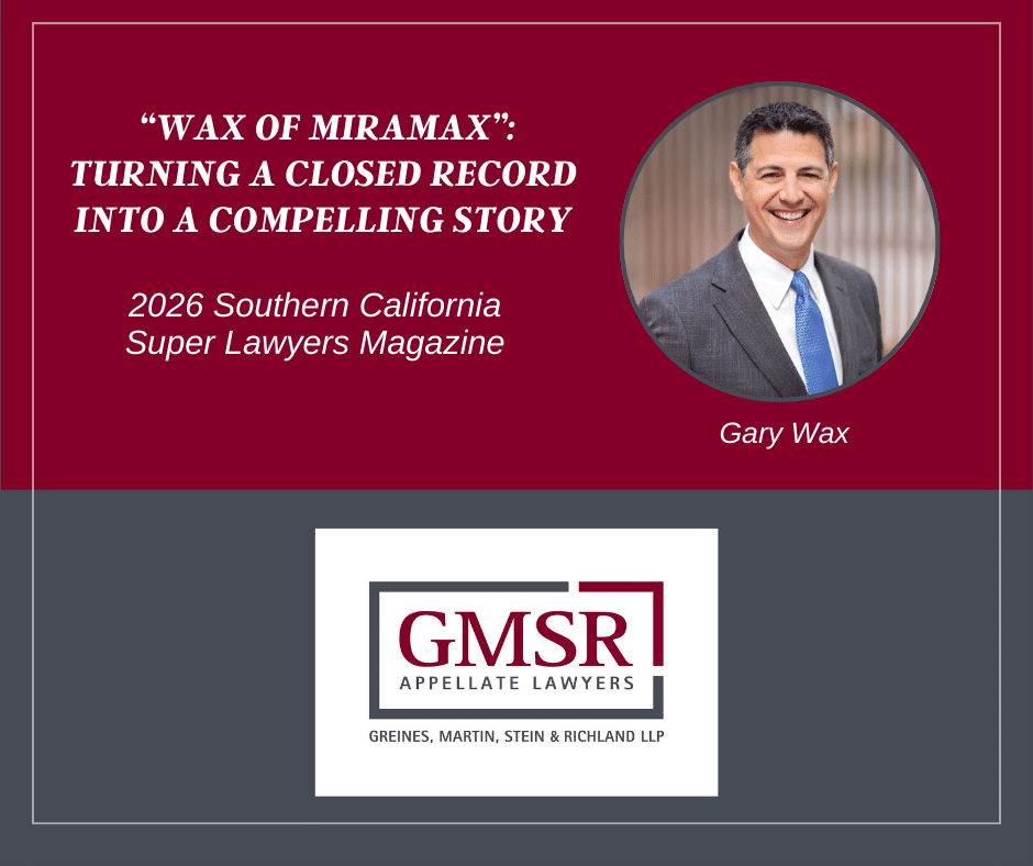Before he began drafting legal briefs for the Courts of Appeal, GMSR partner Gary Wax honed his storytelling skills while working as a creative executive at independent film distributors, including Miramax Films.